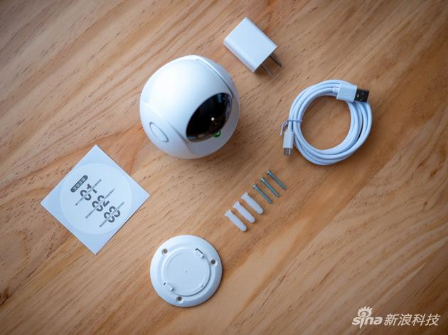 打开外包装,我们就能看到摄像机本体。整体的包装比较简洁,附件部分包括产品说明书、充电器、数据线、以及云台基底和固定螺丝等。除此之外,还有一张安装步骤的贴纸,还是比较贴心的。