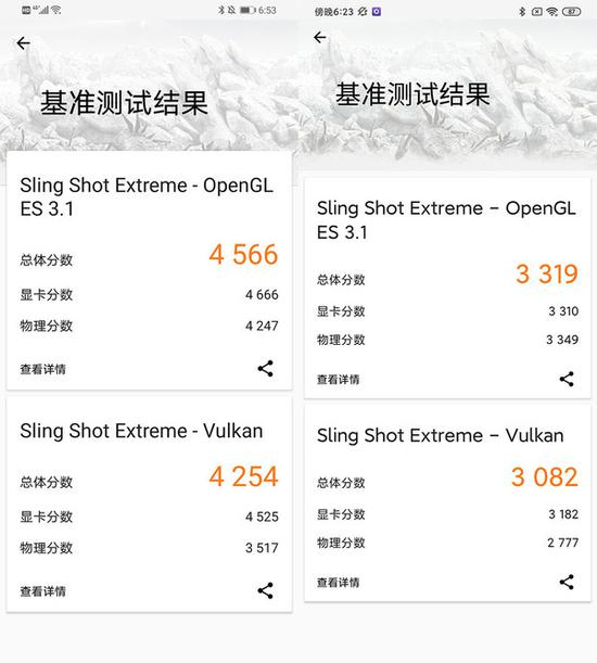 但仅靠CPU来进行性能输出是不够的,还需要GPU提供更加强大的图形处理能力。麒麟820在3D Mark中的Sling Shot Extreme和Vulkan模式测试中均强于骁龙765G。