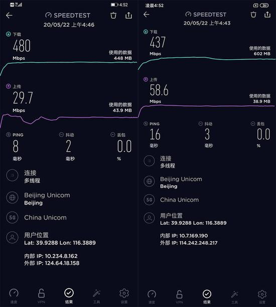 而在实际网速中,我个人使用的是中国联通5G卡,套餐为199元的冰淇淋5G套餐。荣耀X10基本可以跑满该套餐网速,下载速率稳定在480Mbps左右,上传速率为29.7Mbps,而且ping值和抖动值都很低,这意味着当前网速相当快而且稳定。而小米10青春版的表现就要稍逊一些。