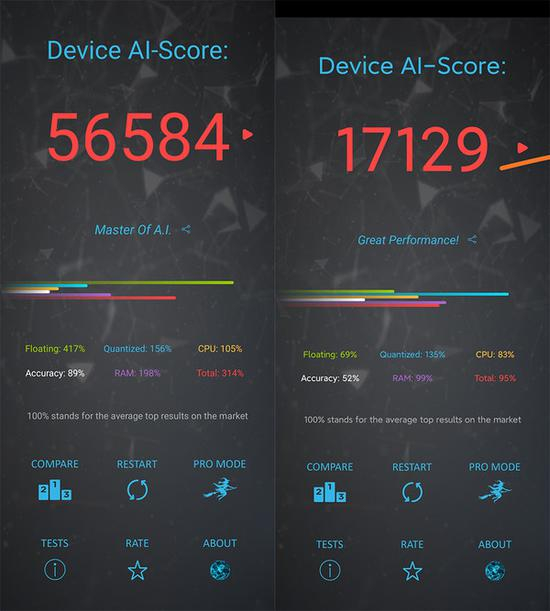 那么两者的AI跑分究竟如何呢?这一环节选择AI-Benchmark进行跑分测试,麒麟820跑分高达56584分,而骁龙765G仅为17129分,差距明显。