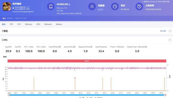 在《王者荣耀》中,荣耀X10的平均帧数为59.9帧,而且从帧数曲线来看,基本保持60帧左右。值得注意的是,这款手机的帧数条除了有几次轻微的帧数波动,表现从整体来看稳定平滑,游戏体验相当不错。而在《和平精英》中,荣耀X10的帧数可以稳定在30帧左右,总体表现稳定。