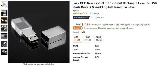 在网上一搜,你也能轻松找到了这个 U 盘的同类。对比看,两者都有着相似的方正外观和水晶头,但普通 U 盘售价只需 10 美元,人家还是 8GB 容量起步。