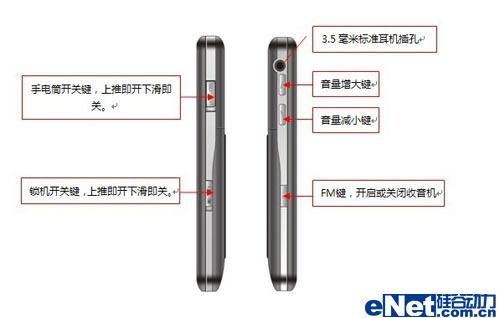 右面的侧键更是体贴人心,手电筒和锁机键使用推拉键设置。这样的功能明确的开关,充分表现出设计者对老人的使用方式的深入研究。充分保留了手电筒和开关锁的传统使用习惯。这一习惯的传承,使得老人感觉在和自己熟习多年的老朋友,老伙伴相互交流。