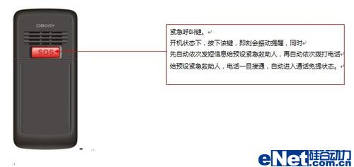 背面还有一个很大的按键,是橘红色的,这就是这款手机的核心按键。SOS键,这个按键在老人遇到困难或需要帮助的时候起到紧急按键的功能,在我们的多次评测下,只要按下这个按键持续3秒种,手机机会发给预先设定的子女或至亲一条求助信息。手机还会自动拨叫预先设定的号码,号码如遇不通的情形,手机会轮流拨叫,直道拨通为止,一旦拨通,就会自动接通,并免提通话。使得老人和亲人能进行无障碍沟通。
