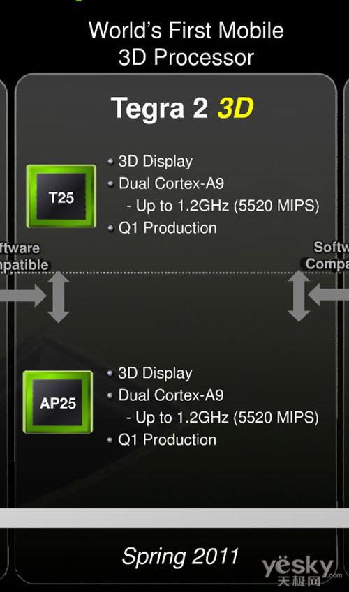 据TechEye网站获得的Nvidia移动世界大会的演示文件披露,Nvidia将在今年推出适用于配置3D显示屏的移动设备的Tegra 2 3D处理器。这种新的处理器将以时钟速度为1.2GHz的双核Cortex A9处理器为基础,提供每秒执行55.2亿条指令的能力。Nvidia将在今年第一季度出货这种处理器。