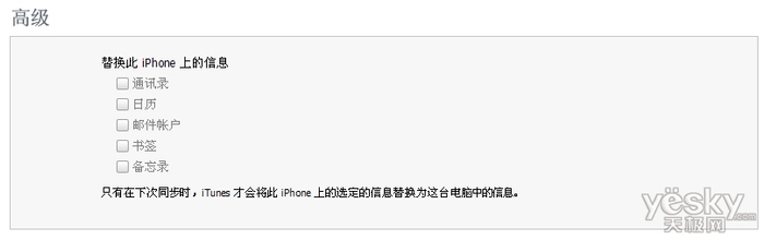 1、iPhone连接上iTunes后,点击设备下的iPhone图标,找到下面通讯录,在同步通讯录前的复选框打上勾,后面选择要备份的地方(以Yahoo为例),选择后弹出下面的对话框。