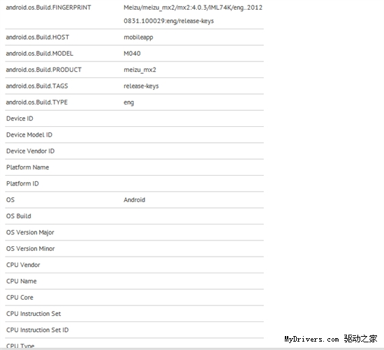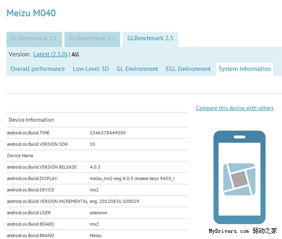 机器参数也在其中 魅族MX2智能机跑分曝光 驱动之家 2012.09.0411:09 关注 J.Wong已经许久没露面了,莫非魅族已经开始了下代梦想机型的研发工作。现在有煤油就在魅族官方论坛曝光代号为M040的新终端。有煤油爆料称,为了增强用户体验,MX的升级版将会使用屏幕贴合技术,同时它的屏幕尺寸比现在的MX更大,边框也更窄。很快我们就从GLBenchmark网站上,发现了这款M040的魅族新终端的跑分情况,从上面的信息来看,其屏幕分辨率为1280×800像素,同时运行的是Android 4.0.3系统,其内部代号为MX2。 网上流出的拍摄图 跑分网站上流出的参数