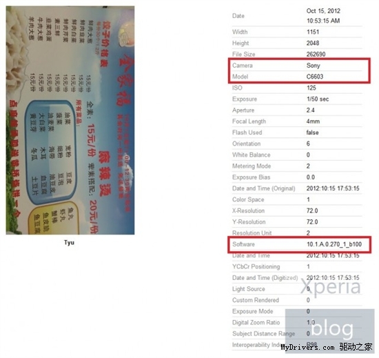 从样张的EXIF信息可以看到,索尼Yuga目前已经运行上Android 4.1.1系统,固件版本号为10.1.A.0.270。