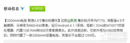 根据移动信息官方微博曝料的信息显示,联想P770依然采用直板触屏设计,外观与联想K860十分相似。在联想P770的机身正面,这款手机拥 有一块4.5英寸超大触摸屏,分辨率则为qHD(540×960像素)级别,同时还拥有800万像素的后置摄像头,可以满足用户日常的拍摄需求。