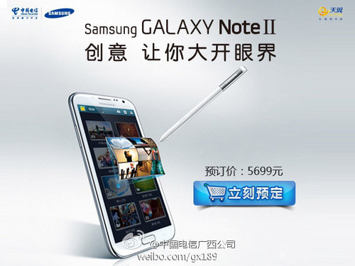 就在前不久,三星GALAXY Note II的中国移动定制版机型(N7108)已经开始发售,售价5199元,而紧接着中国电信定制版机型也开始接受预订了,不过价格稍贵,为5699元。