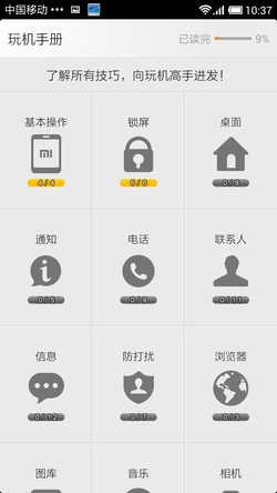用过一段时间就会发现,MIUI是一款基于用户考虑的系统:它对下拉通知栏做了相应改进,将各种常用功能的开关集中一页而不仅仅是顶部的指示条,玩 机手册则内置了手机所有功能的操作说明,安全中心则自带病毒扫描、流量监控、密码保护、备份、防火墙和后台程序管理等实用功能,上手就能用,免去了用户再 去第三方市场找软件的麻烦。这样一来,用户对新设备的学习门槛降到了最低,发烧手机并不要求用户懂多少电脑知识,简单明了的操作和功能设定任谁都能轻松上 手。