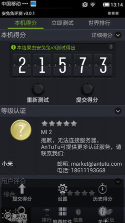 低配安卓机无人权已是共识,在小米2的发布会上,雷军曾自封小米2为“跑分天王”,图形效果堪比XBOX,并在发布会现场秀出小米2和三星猎户座四核、Nvidia Tegra3四核手机的跑分对比,力证小米2的强悍性能,因此拿到小米2之后,跑分是大家共同的兴趣点。