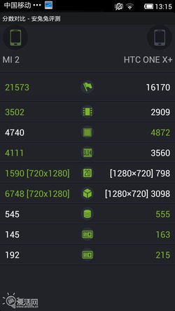 其他几款热门产品如超频Tegra3手机HTC One X+和魅族MX四核等都不是小米2的对手,除I/O外,所有测试项目完败。
