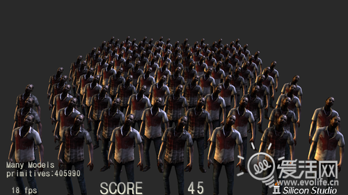 DEAD PARKING:测试表现大量多边形复数3D角色时GPU性能,以及3D角色动作时的CPU性能,还有阴影条件下GPU性能。该项目所用3D建模多边形数量达到24只僵尸同时出现时一只僵尸2000个,主人公有3300个,背景则有1万3000个。