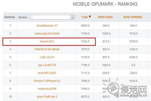 在Mobile GPU Mark官网上可以看到跑分成绩的全球Ranking排名,每款设备的综合跑分成绩取所有上传跑分的平均值,可以看到小米2(Xiaomi MI2)以7632.5分的综合成绩排名第三,前两名分别被神秘设备SmartDeviceX7和三星SCH-i200霸占。