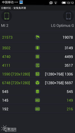 Antutu跑分软件是一款Android平台性能测试软件,它针对CPU、内存、I/O输入输出、2D及3D图像等项目提供了一键式的完整测试, 测试成绩越高越好。通过测试可以看到,小米2的Antutu跑分达到恐怖的21573分,完胜采用Exynos 4412猎户座四核的Galaxy S3和Note2,差点忘了,Tegra3四核产品已经被挤到前五名开外了……令人意外的是,同样采用APQ8064处理器的谷歌四儿子Nexus4和 LG Optimus G竟不敌小米2,只能说小米2优化太出色了。