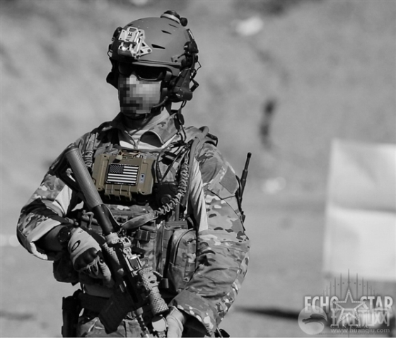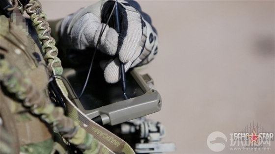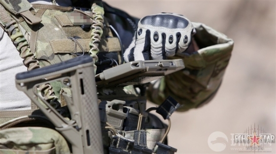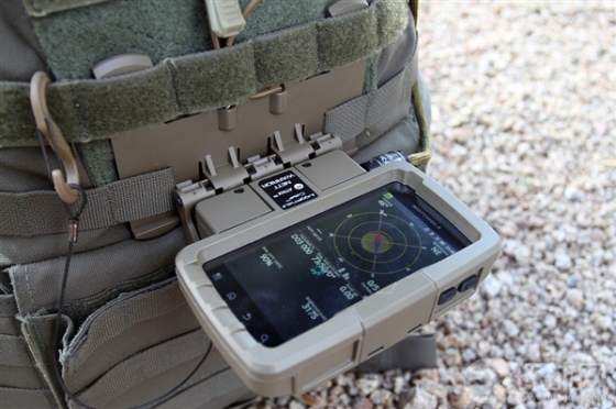 全副武装的美国特种部队士兵,其所使用的智能手机安装在其胸口的战术模块内。