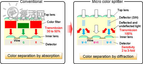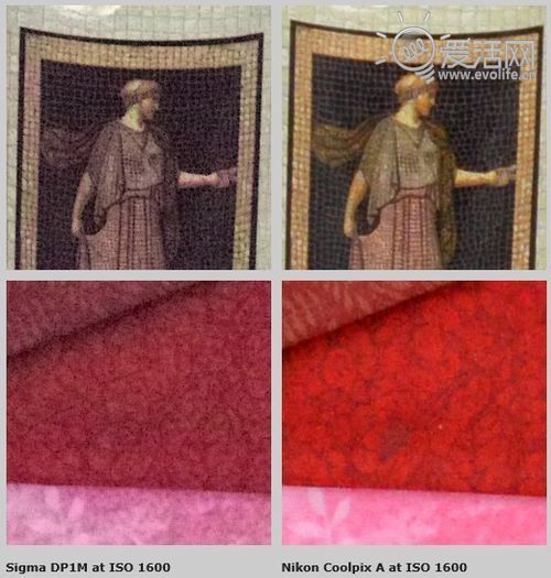 Ultra Pixel超像素技术无疑是基于拜尔阵列,若抛弃拜尔阵列有无提高感光度的可选方案呢,比如Foveon X3。Foveon X3结构上与胶片有相似之处,单个像素即可接收RGB三原色光,理论上拥有极高光子利用效率,但现实的残酷的,上图是Sigma DP1M与Nikon COOLPIX A在ISO 1600下的对比图,前者图像细节、色彩一塌糊涂,实际上Foveon X3量子效率极低,若把Foveon X3技术用于手机传感器,那恐怕只有ISO 50可用了。在可预测的将来,松下的微分光棱镜技术更有助于改善手机传感器画质,不知HTC日后能够抢先采用。