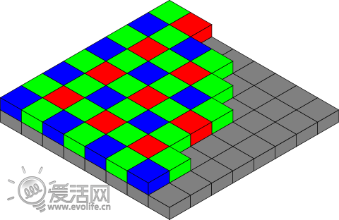 CCD、CMOS是两种常用光学传感器,它们能将光子转换为电信号,进而记录图像,但它们只能记录光子的强弱、没法获知光子的色彩(波长)。为了记 录了彩色图像,Bryce Bayer(布莱思·拜尔)发明了一个后来称为拜尔阵列的彩色滤镜阵列。拜尔阵列最基本单位是1红2绿1蓝滤镜的2×2方格阵列,每个滤镜与CCD、 CMOS上的像素一一对应,在像素数量不低于一万时,可以通过一套复杂的算法猜出图像色彩。由于四个像素才能获得一个完整的RGB信息,因此每个像素实际只有25%蓝色/红色信息以及50%绿色信息,其他信息只能通过插值获得。