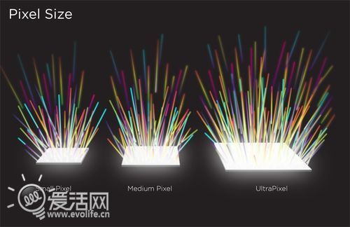 依靠少像素策略,Ultra Pixel获得比一般手机用CMOS传感器的更大像素面积,根据HTC官方数据,在Ultra Pixel技术下每个像素的面积达到了4微米平方,而8MP CMOS每个像素面积小于2微米平方、13MP CMOS每个像素面积小1.3微米平方。(比如Omnivision OV8835、OV12830均是4:3长宽比、1/3.2英寸CMOS,前者拥有8MP像素、每个像素尺寸为1.96微米平方,后者拥有12MP像素, 每个像素尺寸为1.44微米平方。)