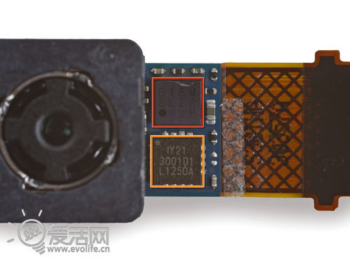 根据外媒拆解,HTC One的摄像头模块由ST Microelectronics 5869 BA四百万像素的BSI CMOS、InvenSense的陀螺仪与一块用途不明的Renesas芯片组成,考虑到该CMOS长宽比为手机中少有的16:9以及1/3英寸尺寸,可 以推断出这是一块定制的传感器,而非早前推测像素合成而来4MP CMOS。