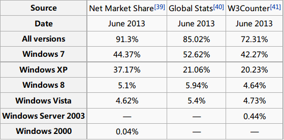 此图来自维基百科,可以看到尽管已经过去11年,WindowsXP仍然占据可观的市场份额
