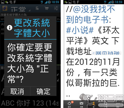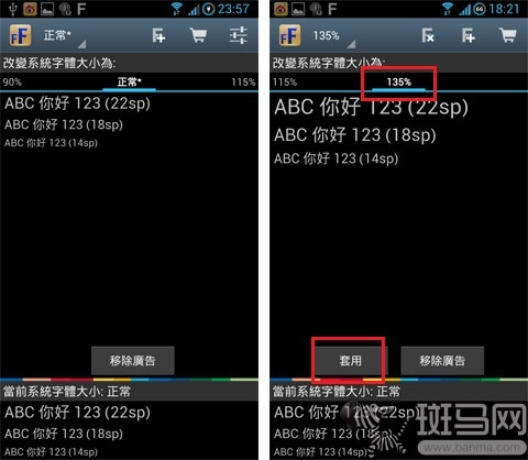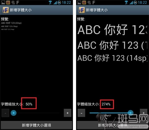 仔细的朋友大概已经发现了,应用中默认只提供了85%、90%、正常、115%、135%一共五个选项。就算是最大的135%,跟自带的最大号字体也没 多少差距啊。别急,点击右上角的“F+”按钮,然后拖动下方的滑块即可自定义字体大小了。从最小的50%到最大的300%,统统木问题!最后不要忘记点击 底部的“新增字体大小选项”就可以。