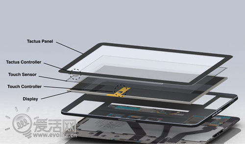 怎么生长出物理键盘呢?很简单,屏幕表面那层是软性材质,底部的液体通过孔输送到上方,就会“挤”出各种形状的凸起物——那就是物理键盘。 Tactus声称,这层微流控面板的厚度有0.75至1毫米,目前会对液晶屏幕的透光性造成影响,但他们的团队会尝试采用各种特制的液体来增强透光性。但 问题是,你会希望自己的屏幕上有个“疙瘩”一样的东西吗?