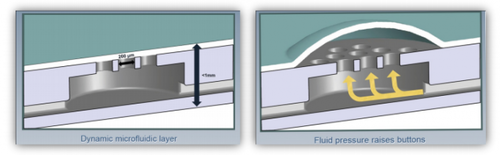 这项技术由Tactus开发,普通LCD液晶屏在表面会使用玻璃与塑料材质,这次他们使用了一种微流控面板加以代替,分为两层——最底部储存有液体,再用一层材料覆盖在上方,两层间有着许多细微到只有200纳米直径的孔。
