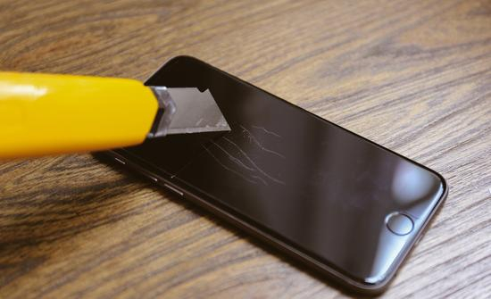 这里重点说说贴膜可能带来的不良影响。首先不能忽略的一点在于,大部分普通贴膜的材质是塑料,硬度低于一般金属,所以很容易造成划痕。例如下图: