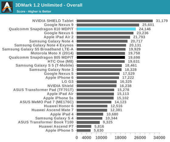 在CPU性能一项,采用骁龙810的MDP平板的表现在不同的测试中有所起伏,但整体而言仍旧属于最顶级的SoC之列,而与前代产品骁龙805相比,GeekBench3有将近30%的提升,与Exynos 5433接近。在针对HTML5/JavaScript网页浏览性能的WebXPRT测试中,搭载骁龙810的MDP平板遭遇了和搭载Exynos 5433的三星Galaxy Note 4相同的问题,整体水平仅仅和更旧的骁龙801持平,这似乎意味着新的ARM A57+A53架构存在着热量疏导(thermalthrottling)或其他问题。