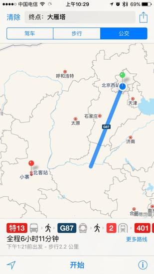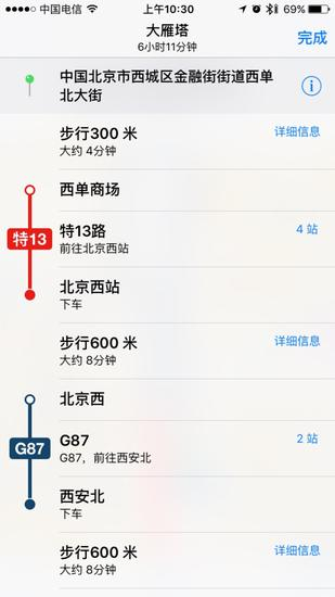 除了市内的公交支持,苹果地图应用甚至支持跨省市的公交线路提供。比方说我们定位要去大雁塔,地图就会给出以下反馈。