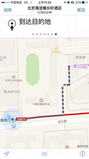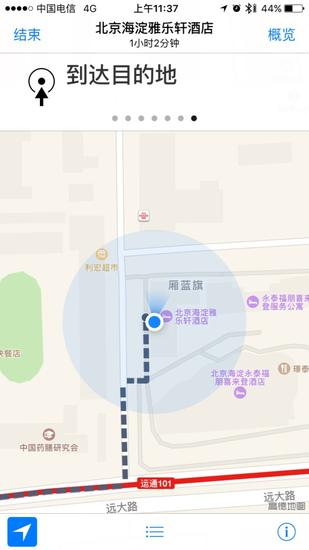 最终抵达雅乐轩酒店,苹果地图也结束服务任务完成。