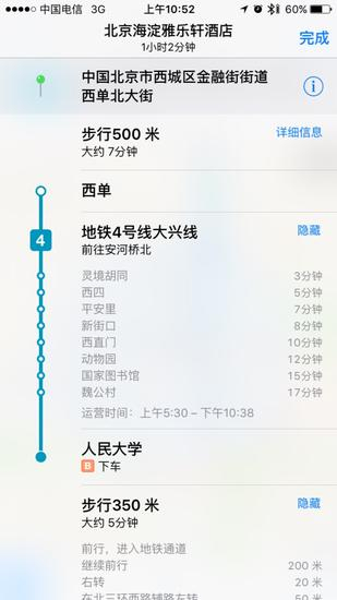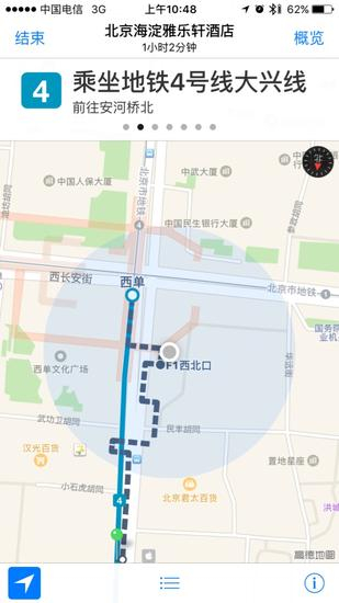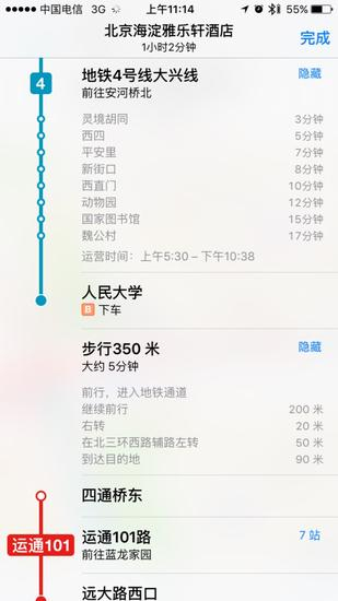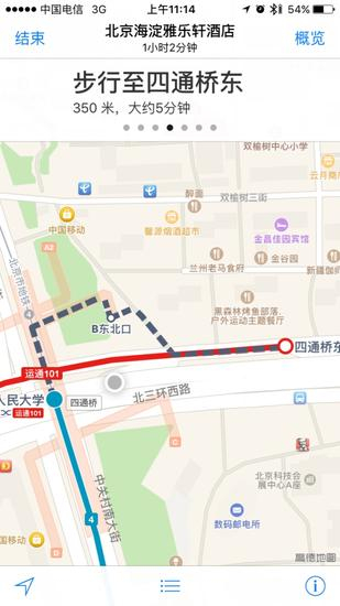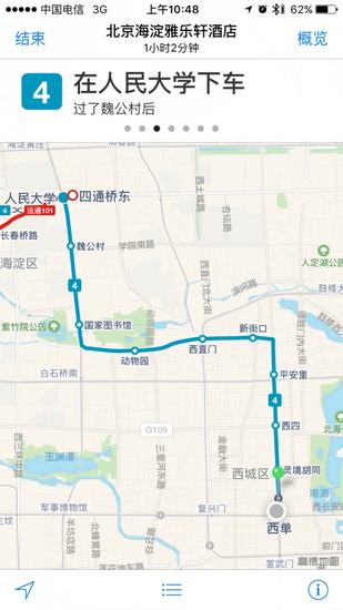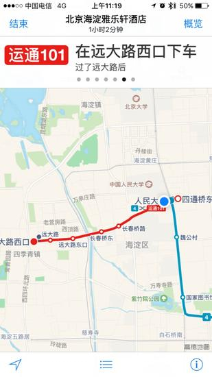 根据预先的行程安排苹果地图会告诉我们在人民大学站下车,并提醒是过了魏公村之后。