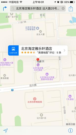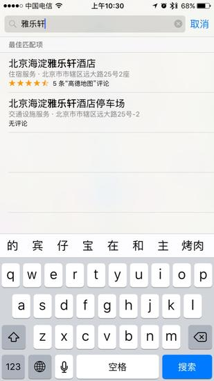 我们此行要去的终点是北京雅乐轩酒店,输入“雅乐轩”最佳匹配项中便显示出我们想要找的内容。