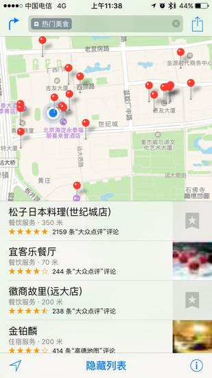 到了雅乐轩酒店基本上就快中午12点了,如果这时候你想搜索下周围的美食苹果地图也能够帮助你完成。