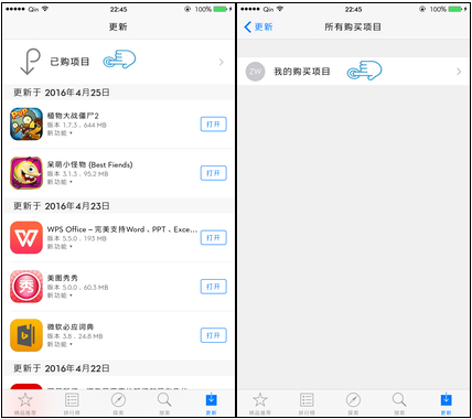 如果你没有开启家庭共享,在更新里面点击已购项目是不会出现购买的项目的,而是直接就看到已购的App,也就无法对App滑动隐藏。