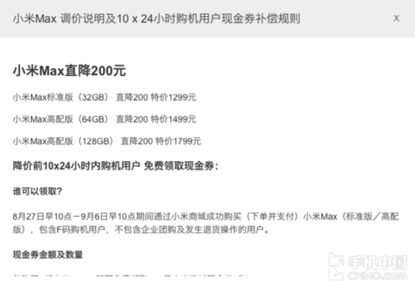 此次调价覆盖小米Max全系产品,调价之后小米Max标准版(32GB)售价1299元,小米Max高配版(64GB)售价1499元,小米Max高配 版(128GB)售价1799元。对于此次售价调整小米官方也针对近10天购机的用户给予一定补偿,用户可在9月6日晚18点后访问小米商城领取200元 现金券,现金券使用有效期为9月13日晚18点-9月27日晚18点。