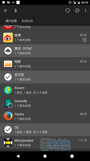 作为一个“流氓杀手”,绿色守护提供的功能相当“基础”,但也极为实用——它的处理机制就是将你勾选上的进程及服务来一波强制停止,而这一切只需要一个按键、一次锁屏或者一次长按Home键。