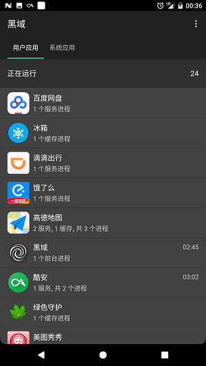 首先来看黑域。按照Android的操作逻辑,在应用中连按两次返回键触发的并不是简单的退回主屏幕,而是杀死进程并退回主屏幕。黑域这款插件所做的,就是让那些投机取巧的流氓应用们彻底认清“返回键”和“Home键”的区别。