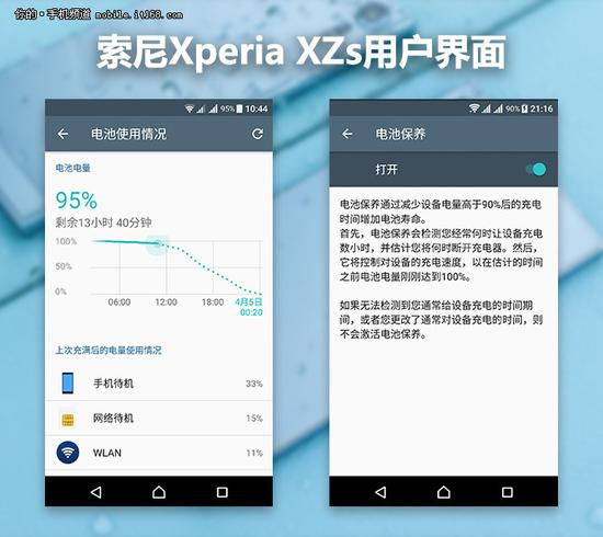 索尼Xperia XZs与XZ的电池容量和处理器完全相同,因此在电量消耗上也相差无几。从我的使用体验来看,在开启双卡双待的情况下、WIFI开启的情况下,索尼Xperia XZs一晚上大约8个半小时的待机耗电5%。整个过程中没有出现微信、QQ、微博等第三方软件的异常耗电情况。比较有意思的是,索尼Xperia XZs能够根据你的使用习惯提示大约在什么时候手机会没电,使用时间越久,它算得也就更精准。