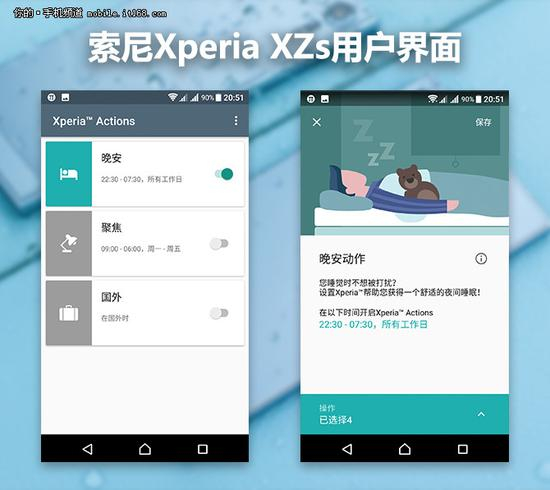 Xperia Actions是索尼Xperia XZs上最新添加的功能。它有晚安、聚焦、国外三种使用场景,能在特定场景下进入自动开启某些功能选项,借此让用户在该场景下得到最好的体验。例如,我每天是10点半睡觉,早上7点半起床。那么在这个时间段,我的手机会自动降低屏幕亮度,开启勿扰模式。这样就免去了半夜被人打扰,晚上用手机看时间也不怕被晃瞎眼了。