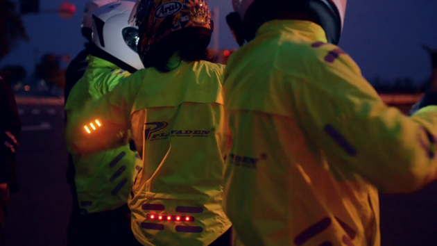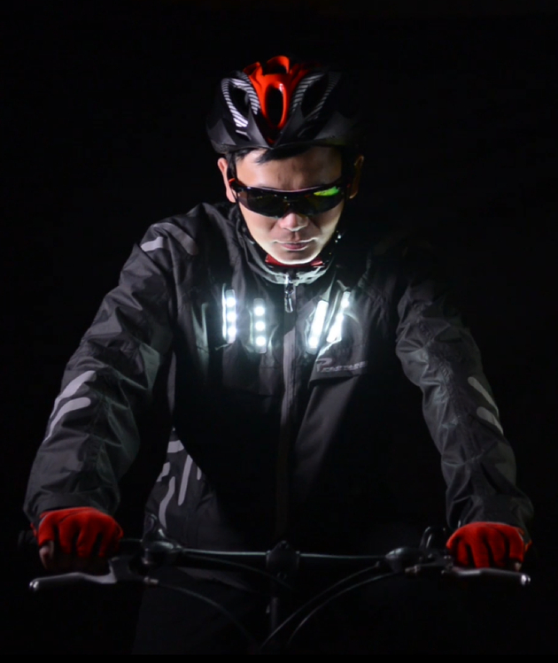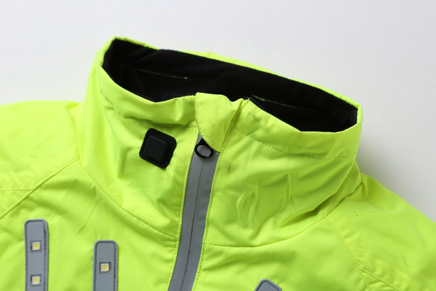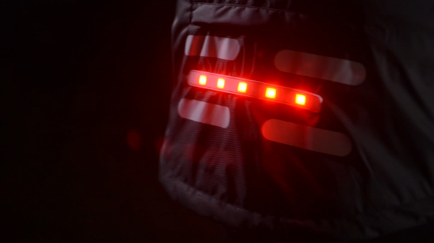 相较于前文中所提的仅靠几片反光条,在Plovade上,你可以通过衣领处的智能控制器指令,分段执行多种频闪模式:快闪、慢闪、长亮。更为智能方便的是,手臂处灯带自动感应发光,骑行者在转弯时只要按照规定打手势,手臂上的LED就会亮灯示意;其他道路上的人就更清楚骑行者的去向。
