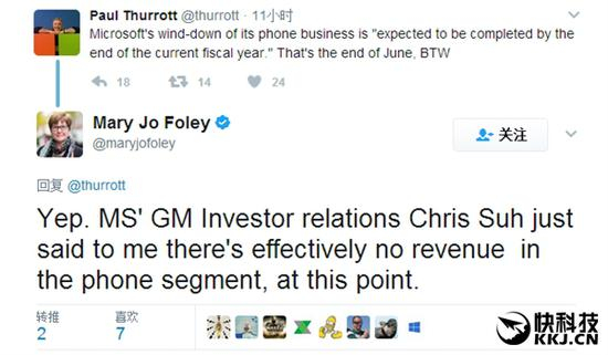 而长期跟踪微软动态的Mary Jo Foley也补充说,微软投资者关系总监Chris Suh已经告诉她,目前手机业务带来的收入基本为零。
