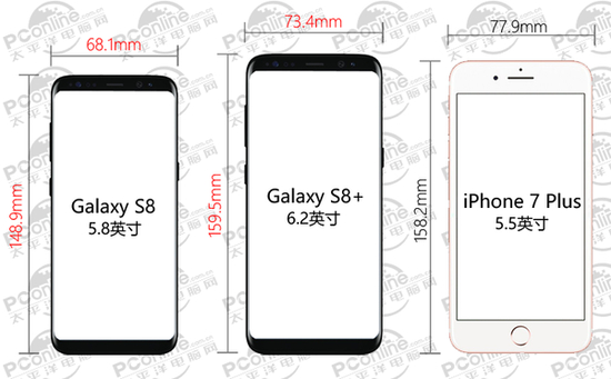 以三星S8/S8+为例,尽管屏幕尺寸达到了5.8英寸和6.2英寸,但是宽度却分别只有68.1mm和73.4mm,带来极其出色的单手握持手感。5.8英寸的三星GalaxyS8比起前代5.5英寸的S7 edge还要小一圈,几乎和iPhone 7相当,而6.2英寸的S8+也仅仅比S7 edge大上一小圈而已。对比iPhone 7 Plus更不必多言。