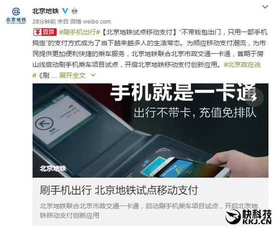 今日,@北京地铁 官微宣布,为顺应移动支付潮流,为市民提供更加便利快捷的乘车服务,北京地铁联合北京市政交通一卡通,首期于房山线启动刷手机乘车项目试点,开启北京地铁移动支付创新应用。
