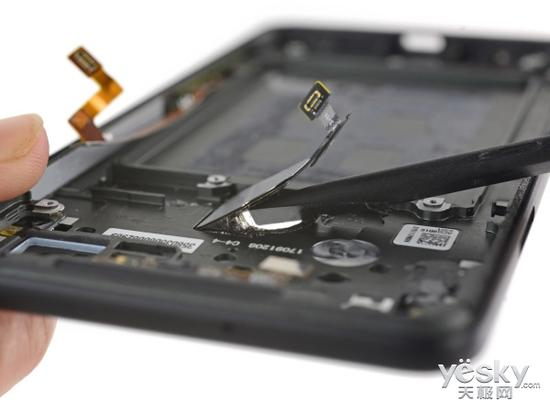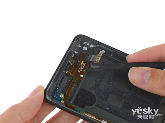 拆解背部玻璃材质区域只能从手机的外部入手,其下方有天线以及连接线缆。