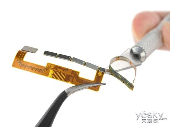 在电路中有多组传感器,ifixit推测这些传感器由变形敏感电阻组成,在挤压、伸展的过程中改变其电阻,从而实现控制。