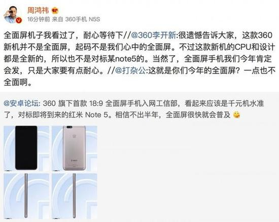 此前曾有媒体称这是360首款全面屏手机,对标即将到来的红米Note 5。不过随后360手机总裁李开新对相关传言做出了回应,他表示“这款360新机并不是全面屏,起码不是我们心中的全面屏。”360公司CEO周鸿祎随后转发称“全面屏机子我看过了,耐心等待下。”