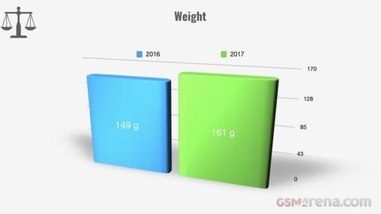 此外,去年智能手机平均重量达到161克,相较前年增加了8%。
